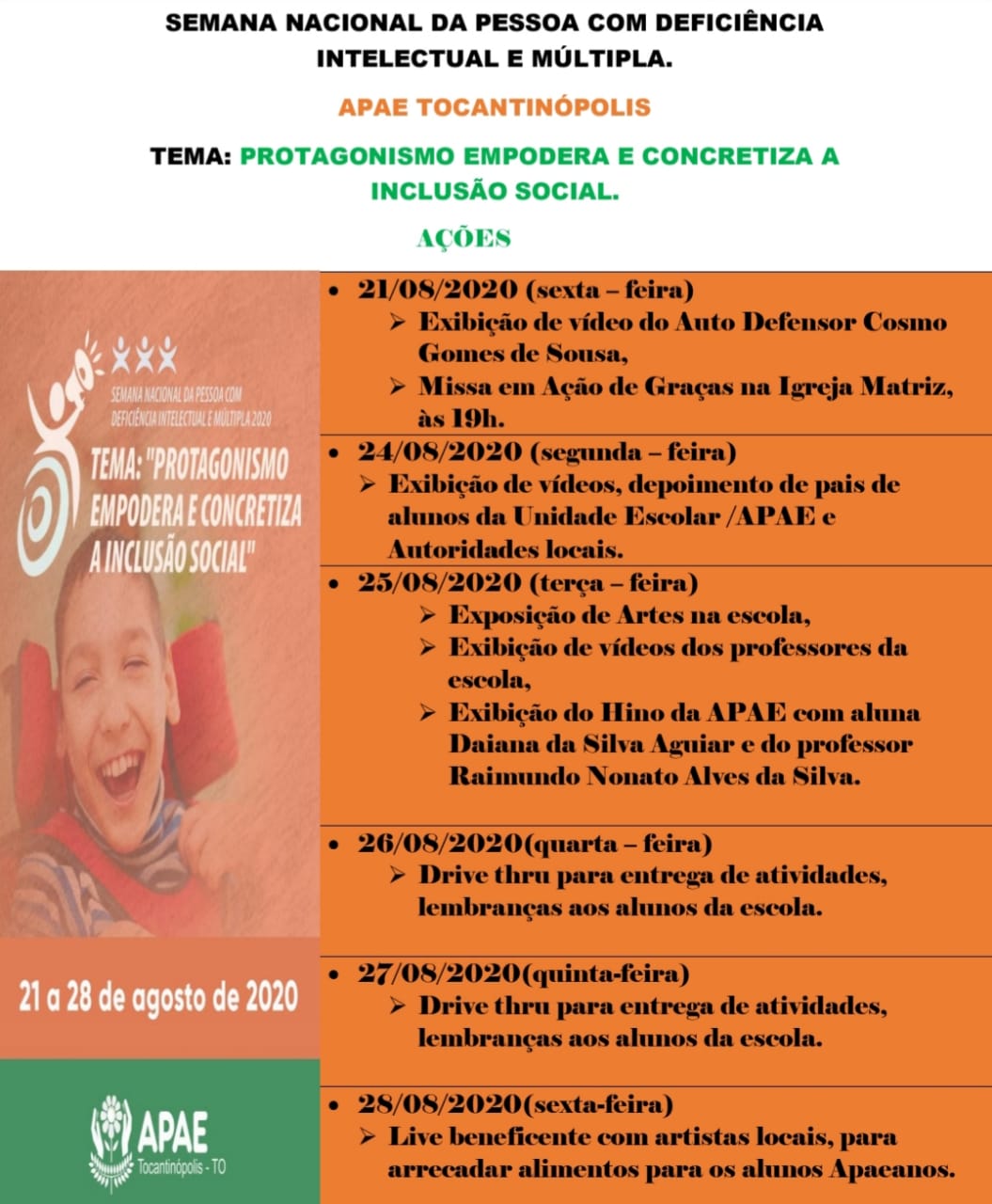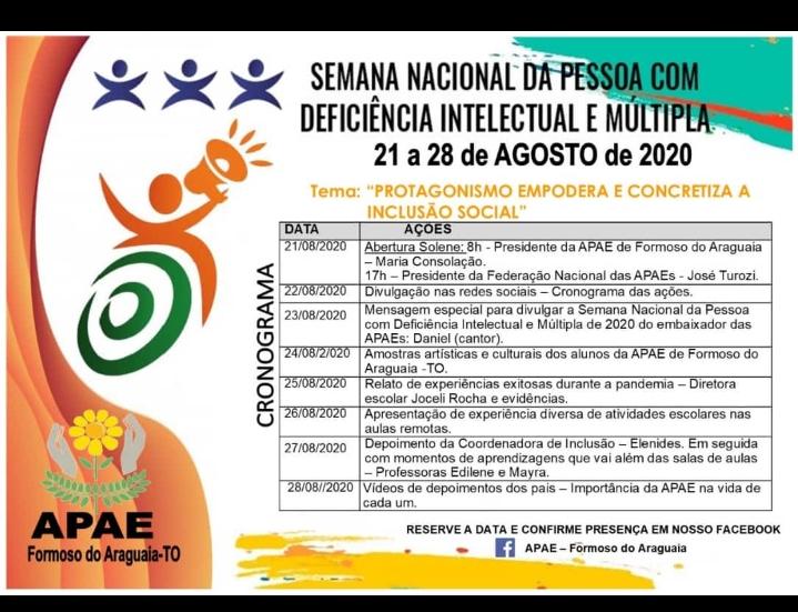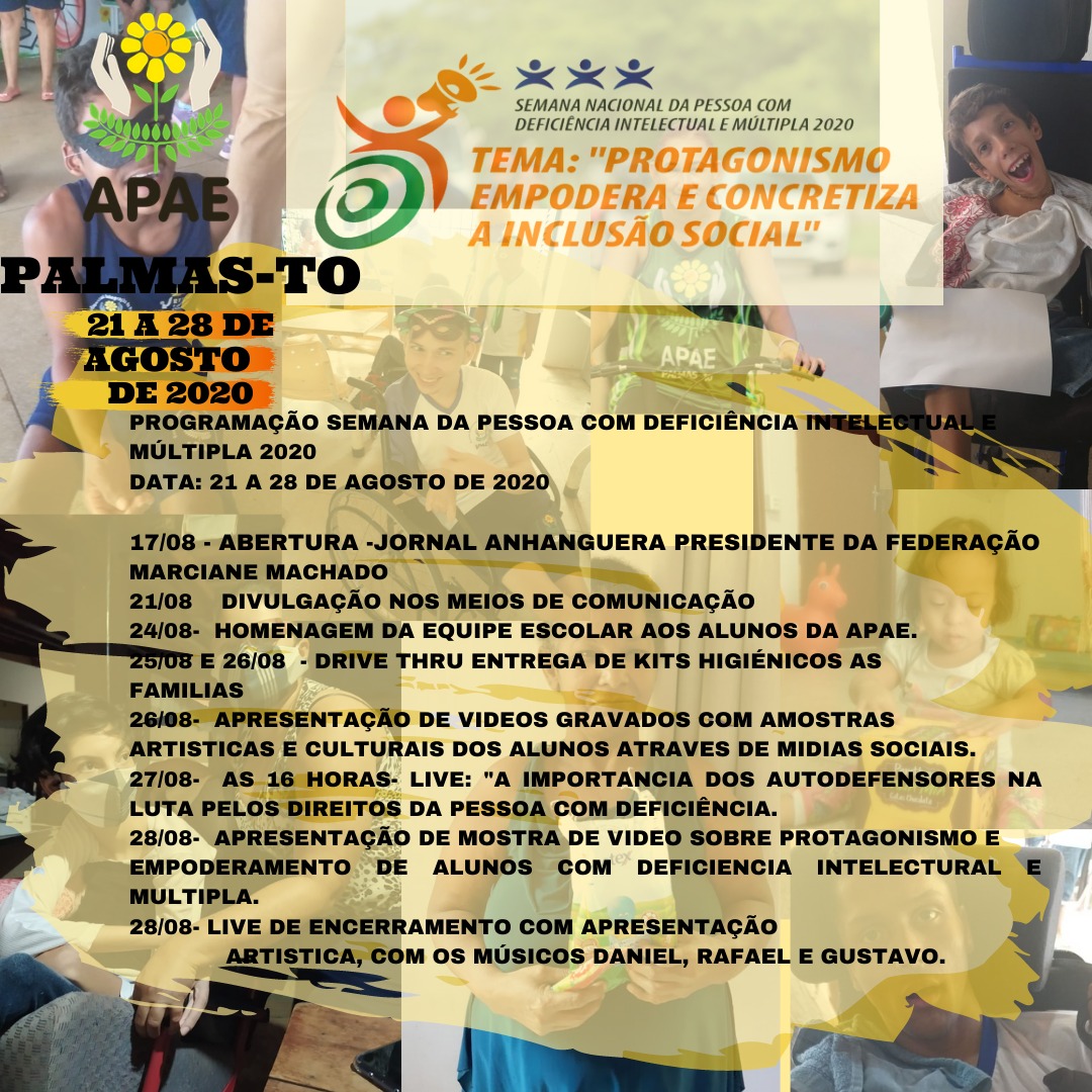 Durante a Semana Nacional da Pessoa com Deficiência Intelectual e Múltipla 2020, a Federação Estadual e Apaes promovem uma vasta programação de eventos, debates e lives sobre o tema da Semana, "Protagonismo Empodera e Concretiza a Inclusão Social".